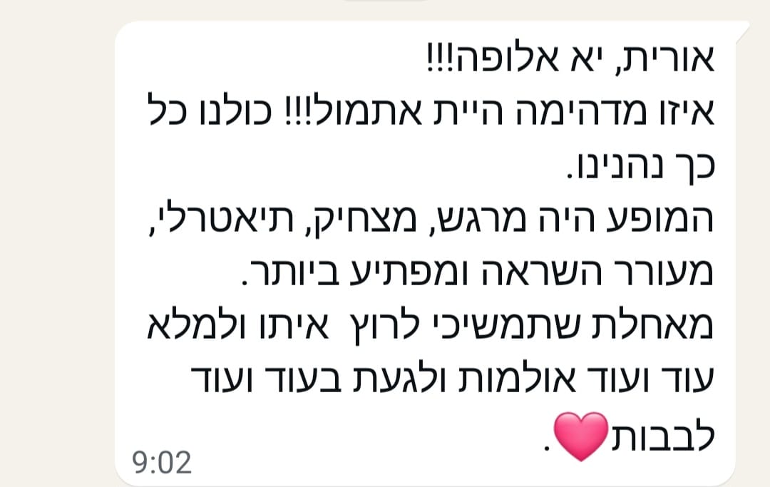 זהו מסע של כוח, כאב, אהבה וחיוך אחד ענק. הצגה שמזכירה לנו כולנו – שגם כשקשה, גם כשכואב – אפשר לקום, להמשיך, ולחייך מתוך הלב.